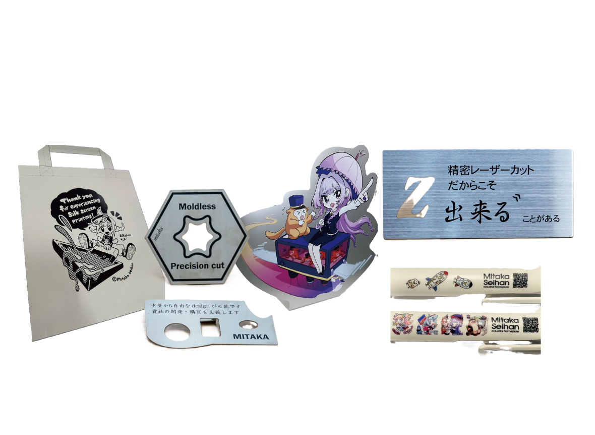 軟質インキ搭載UV INKJET(2.5D印刷)が可能なJFX600-2513にて印刷加工可能です。アルミニウムやステンレスなどの材料も印刷前後に高精度ファイバーレーザー機BREVIS-1212AJにてカット可能です。